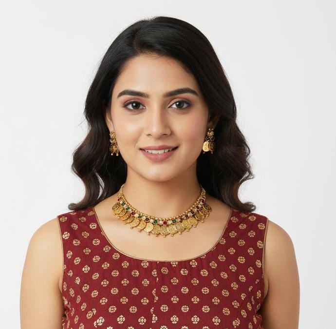 This short collar necklace is a luxurious fusion of the traditional Kasu Mala (coin necklace) and the use of classic Indian gemstones. The design showcases a beautiful fringe of detailed, embossed gold-toned coin motifs with a rich, matte antique finish. What sets this piece apart is the vibrant gemstone detailing: interspersed along the top band are small, brilliant Red and Green stones (Ruby and Emerald colors), which add a pop of traditional color and a layer of preciousness. The entire piece sits high on the neck, like a collar, drawing immediate attention to your face and neckline.