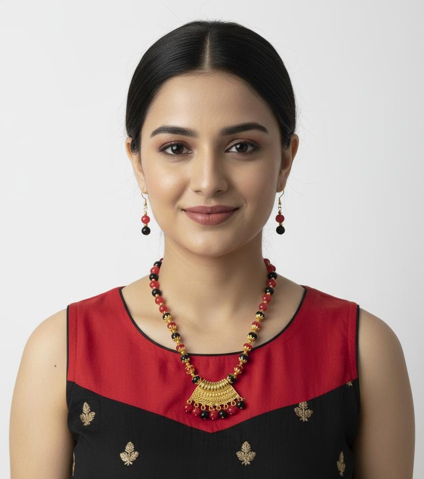 Make a vibrant statement with the Bold Black & Red Beaded Choker with Golden Fan Pendant. This striking necklace set is a perfect fusion piece, combining the classic drama of black and red with an ornate, traditional gold-toned centerpiece. It’s designed for the woman who loves her accessories to be both colorful and sophisticated.