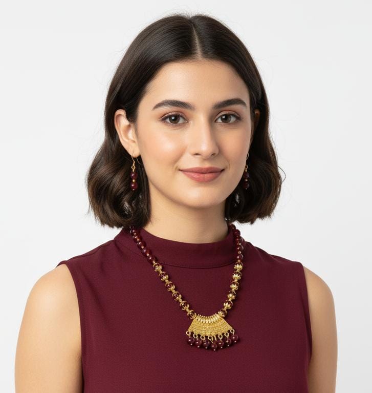 The set is complete with a pair of matching, lightweight Drop Earrings. These earrings echo the necklace’s design, featuring the same beautiful maroon beads and gold-toned elements, creating a polished and harmonious look. They are comfortable to wear, ensuring you can celebrate without distraction.