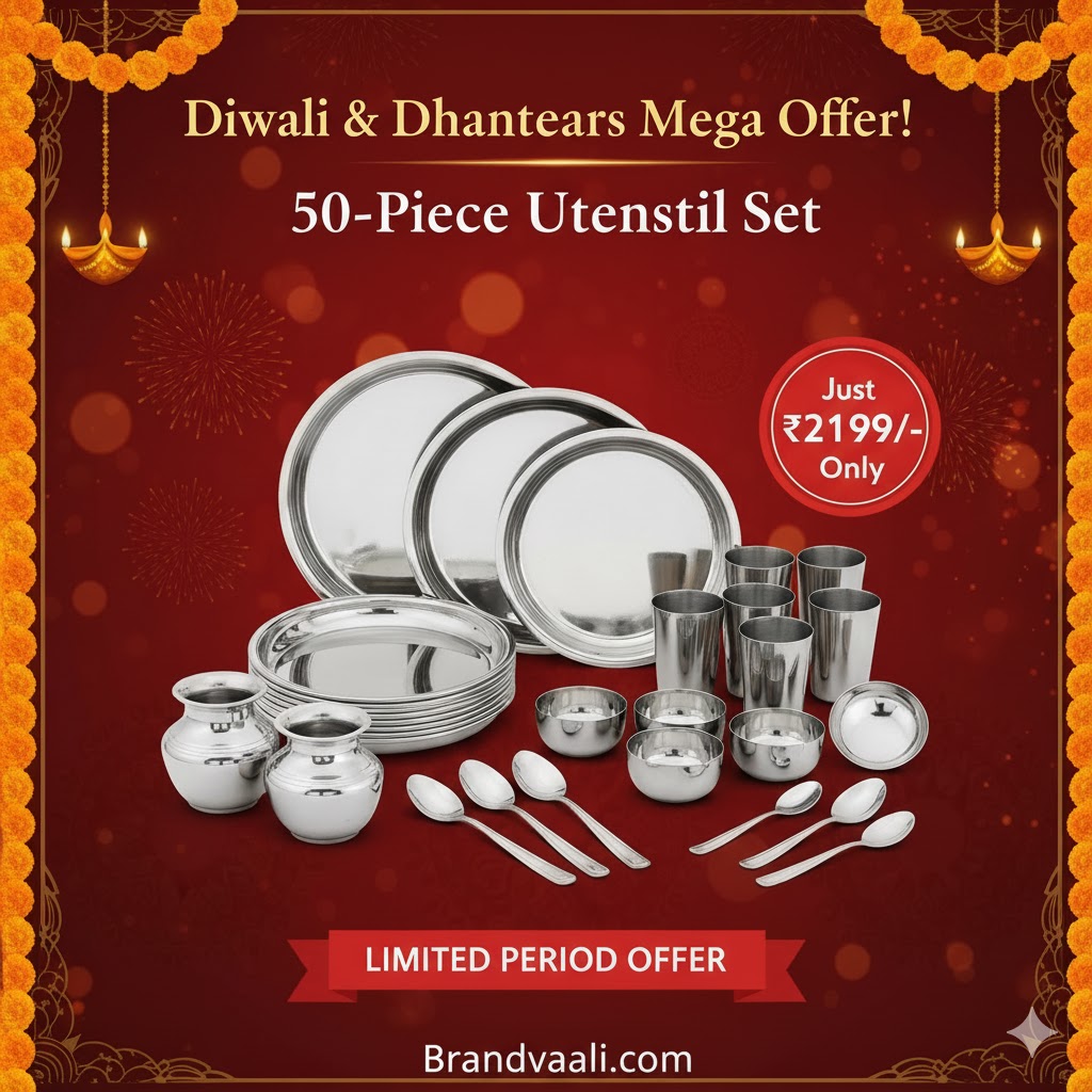 Introducing the Brandvaali.com Luxurious 50-Piece Stainless Steel Grand Dining Set, the most comprehensive and elegant utensil collection designed for the discerning household. This extensive set is perfect for large families, entertaining guests, grand festive celebrations, or as a magnificent gift. Crafted from the highest quality materials, it embodies both traditional utility and modern sophistication.