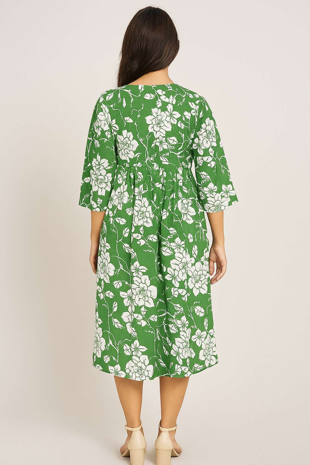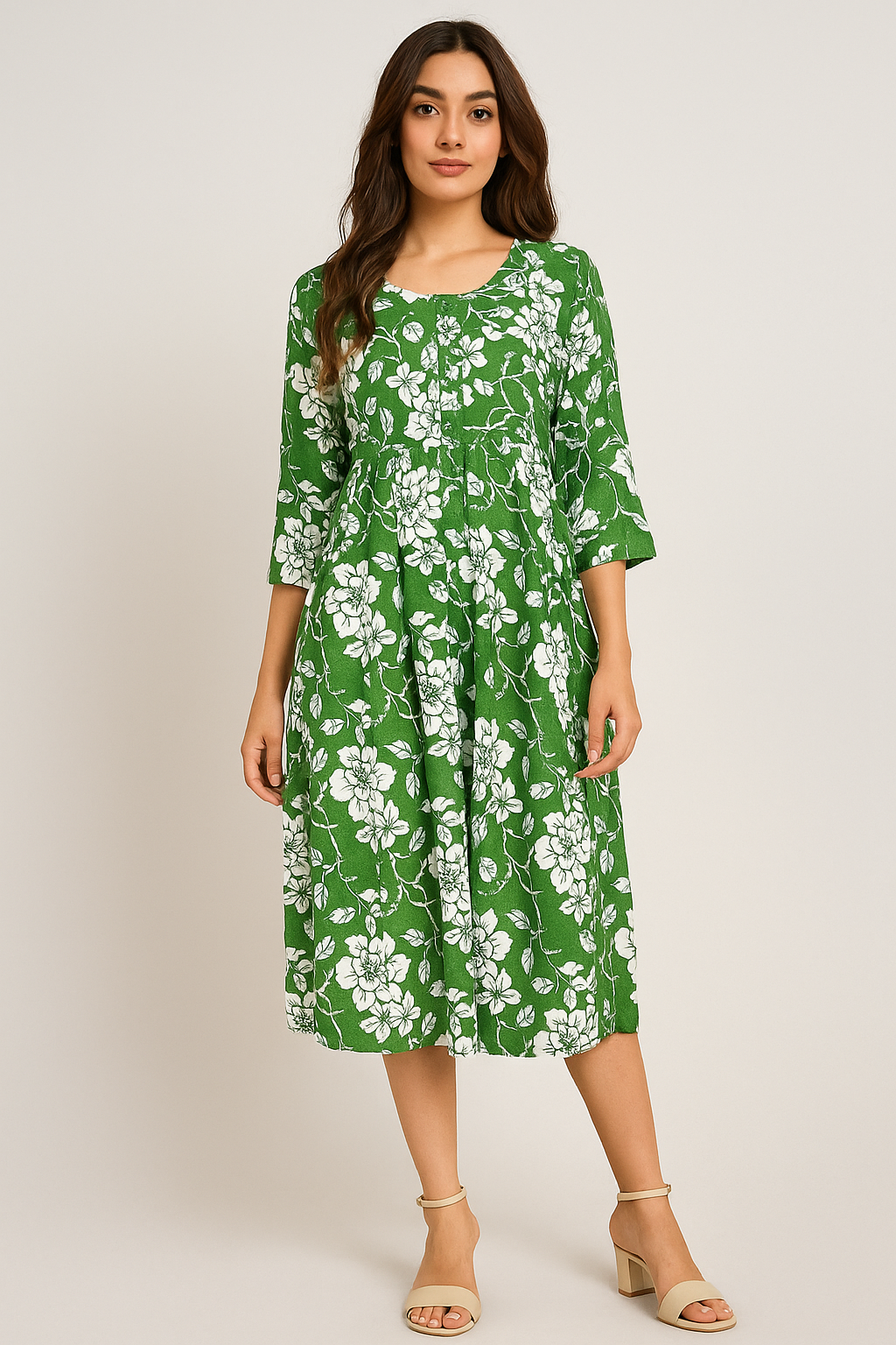 The dress features a timeless, flattering silhouette. It has a modest round neckline that leads to a short, decorative button placket for easy wear. The key design feature is the gentle Empire Waist (high waistline), which is softly gathered to allow the skirt to flare out into an elegant A-line midi length. This cut offers a relaxed fit across the hips and waist while defining the upper body. The sleeves provide stylish coverage.